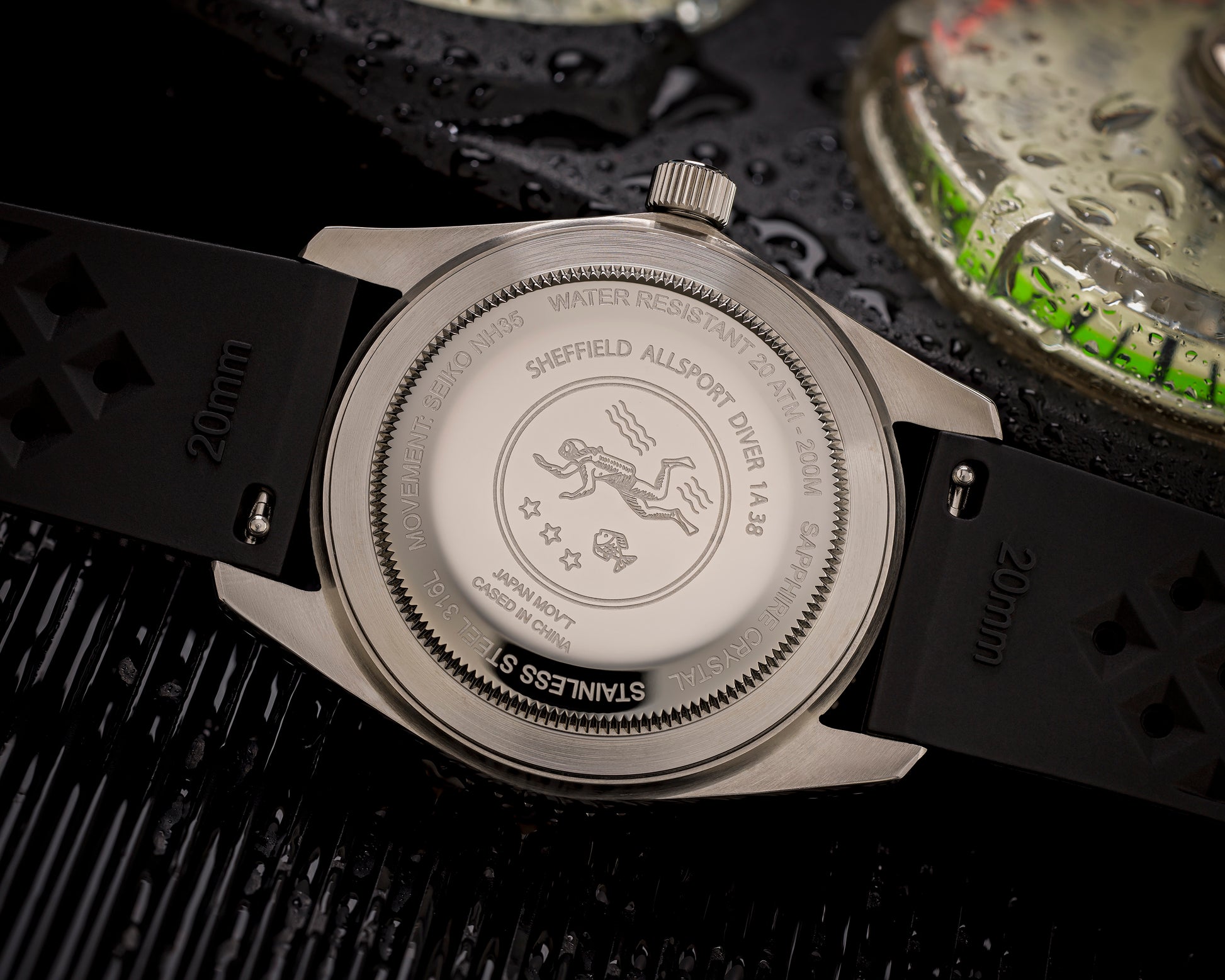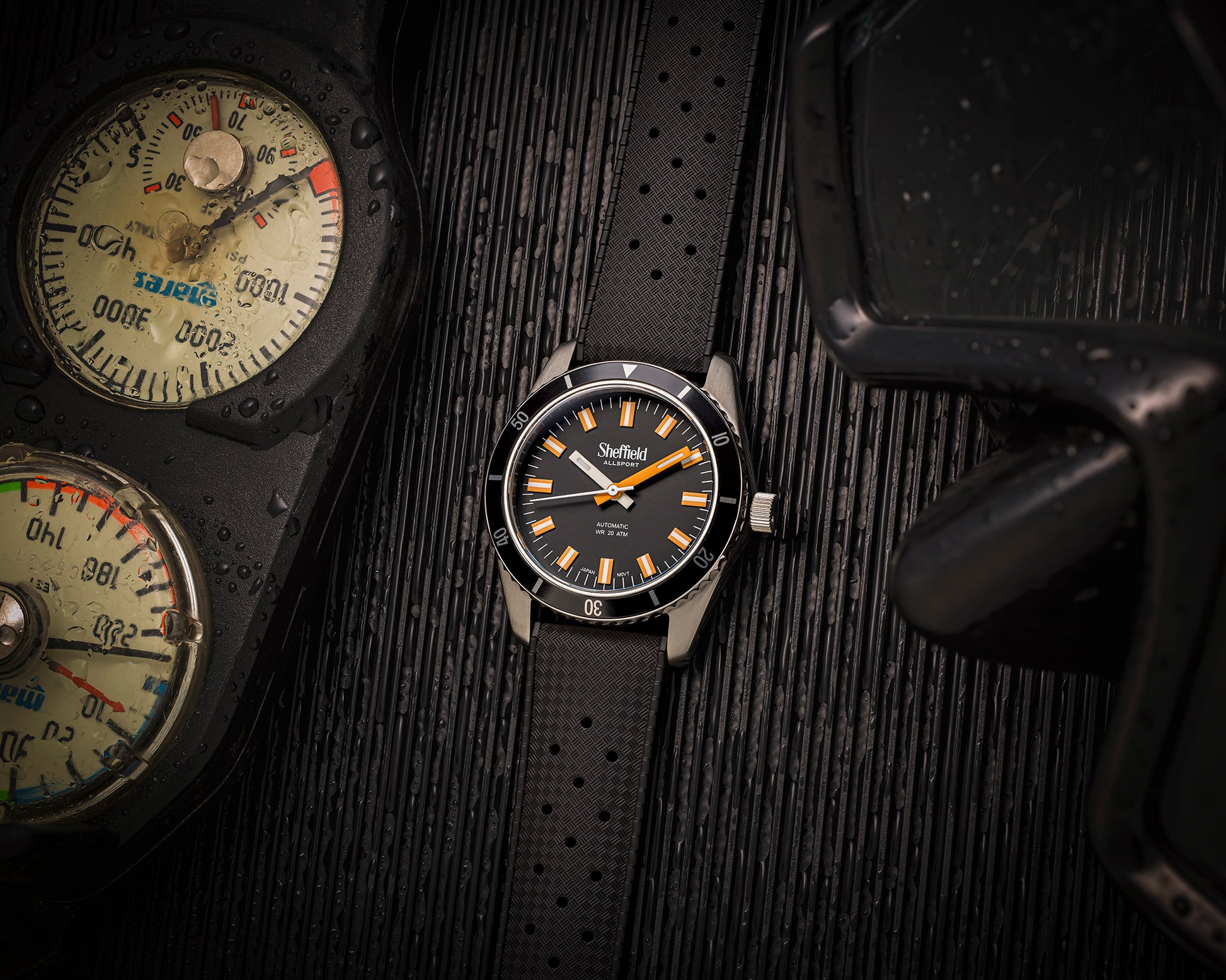 The 1A 38 Black/Orange is a meticulously crafted timepiece, staying true to the design of Sheffield’s iconic 1960s diver. It features a black dial with distinctive block-shaped orange and white markers, both enhanced with Swiss Super-LumiNova® for superior legibility.