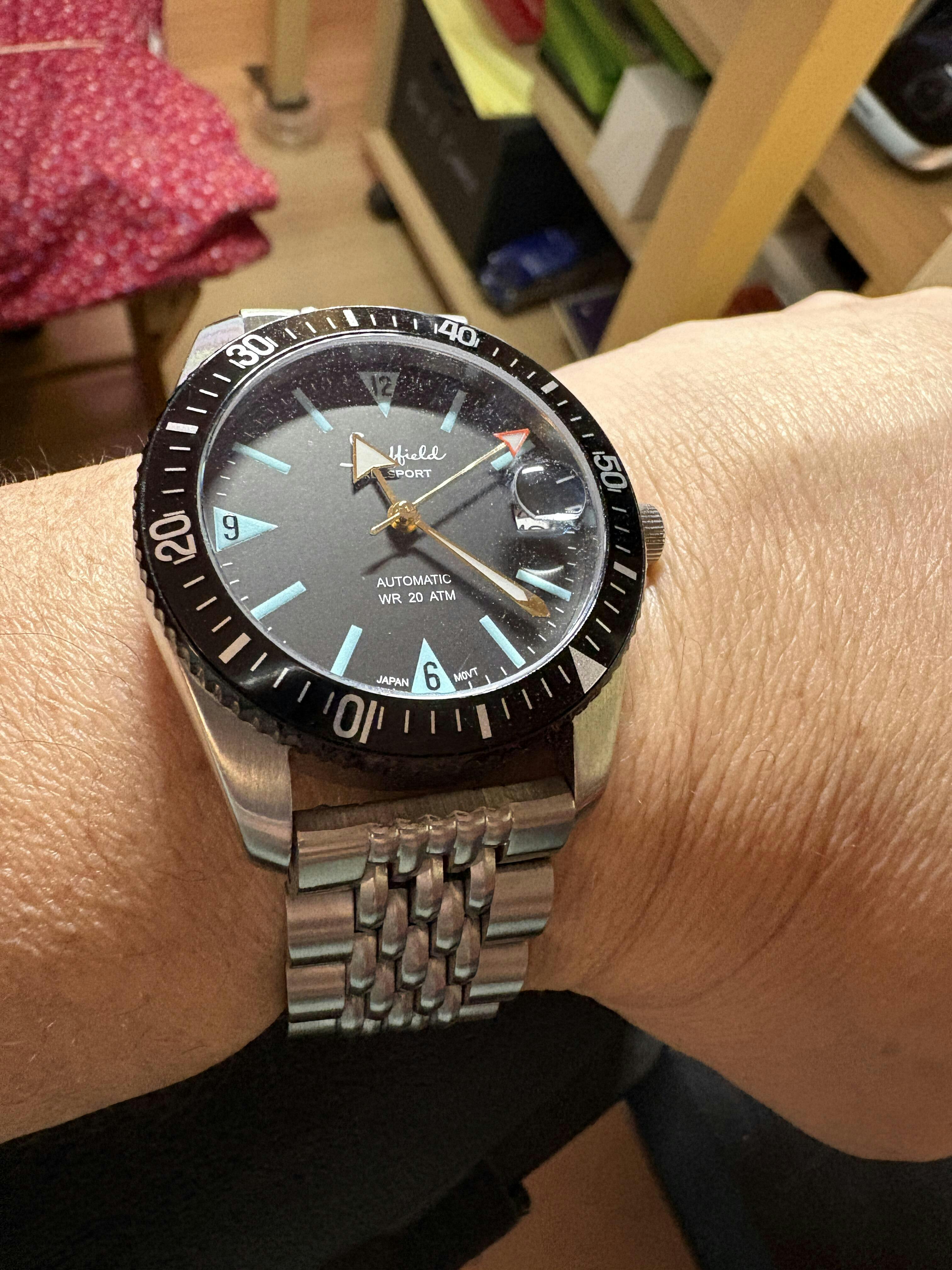 The original designer of this dial and hand combo had a wonderful eye. The blue triangle hour markers on black with the surprising gold hands and white lume along with the red second-hand tip are like nothing I’ve seen before. I can’t help think that this one will take the lead of this collection