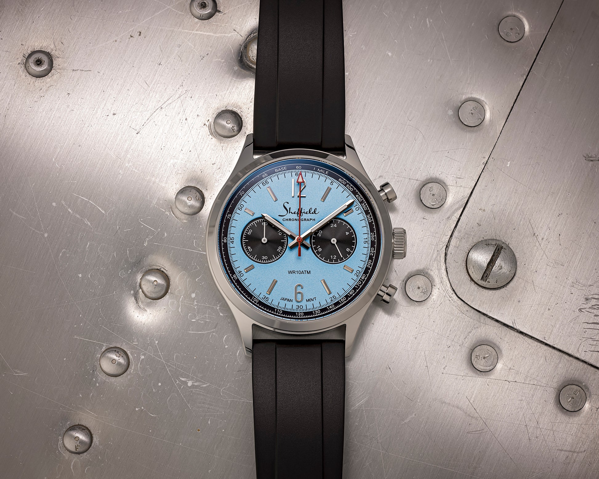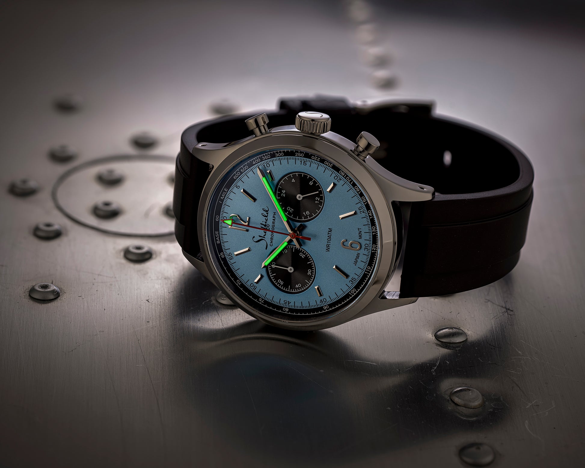 Chrono II Steel Blue is the latest addition to the Chrono II series. It carries the same detailed dial design as the classic black and white models, with styling inspired by Sheffield chronographs from the 1960s.