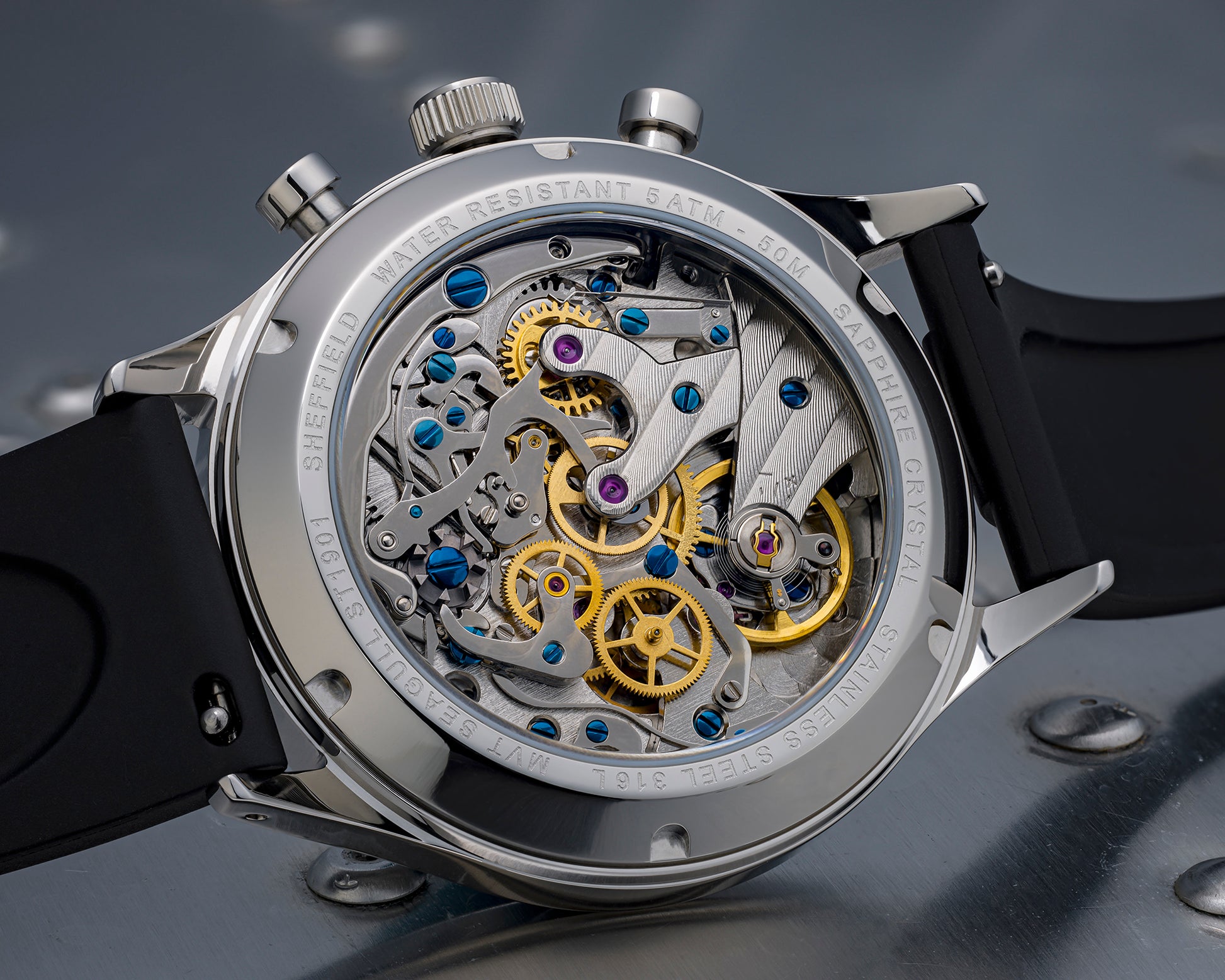 True to original Sheffield Chronograph dial design and colors of the 60’s the Sheffield Case is polished 316L Steel. The Sapphire Crystal with anti-glare coating is a step up from those days as is the 41mm case and 20mm lug width. The beautiful ST1901 mechanical movement is clearly visible in all of its complexity through the exhibition case back.