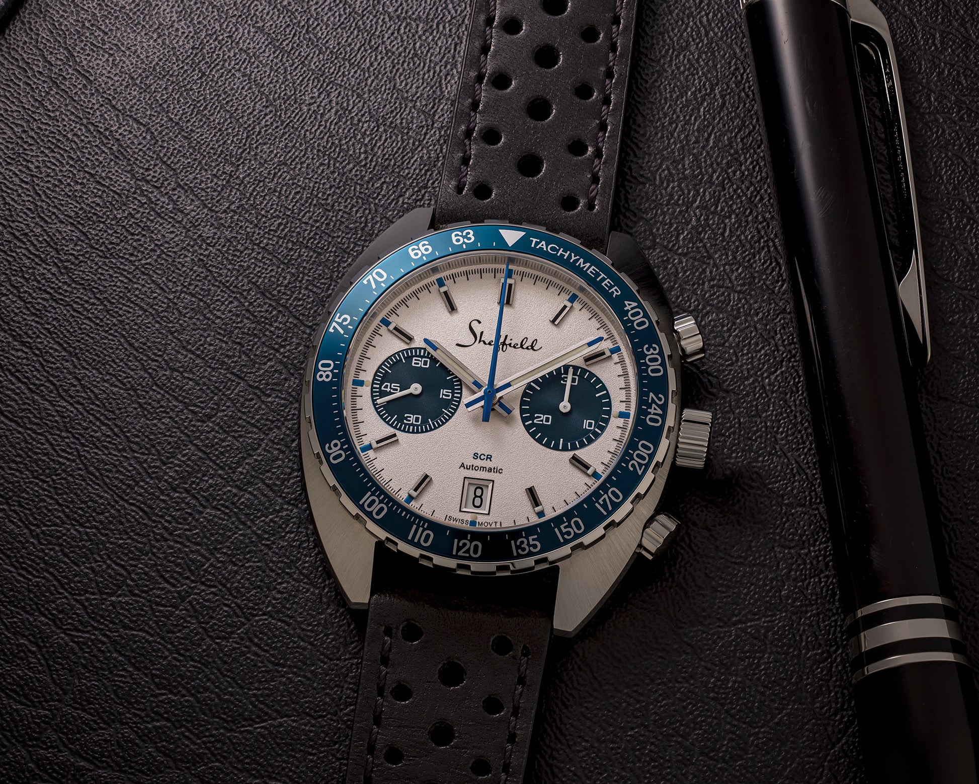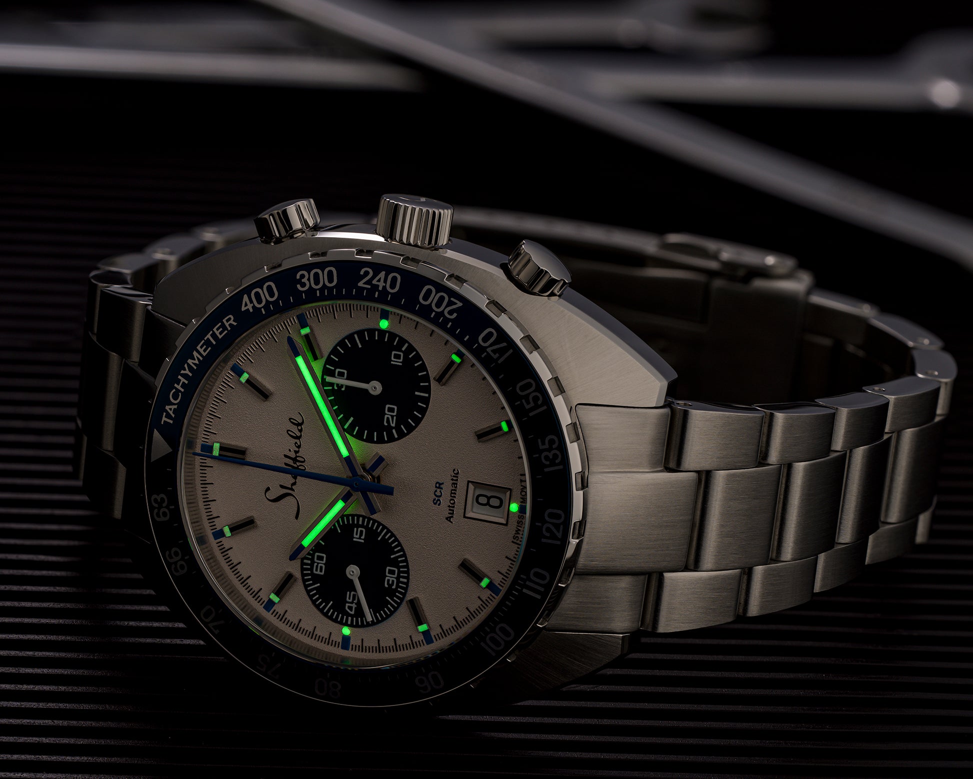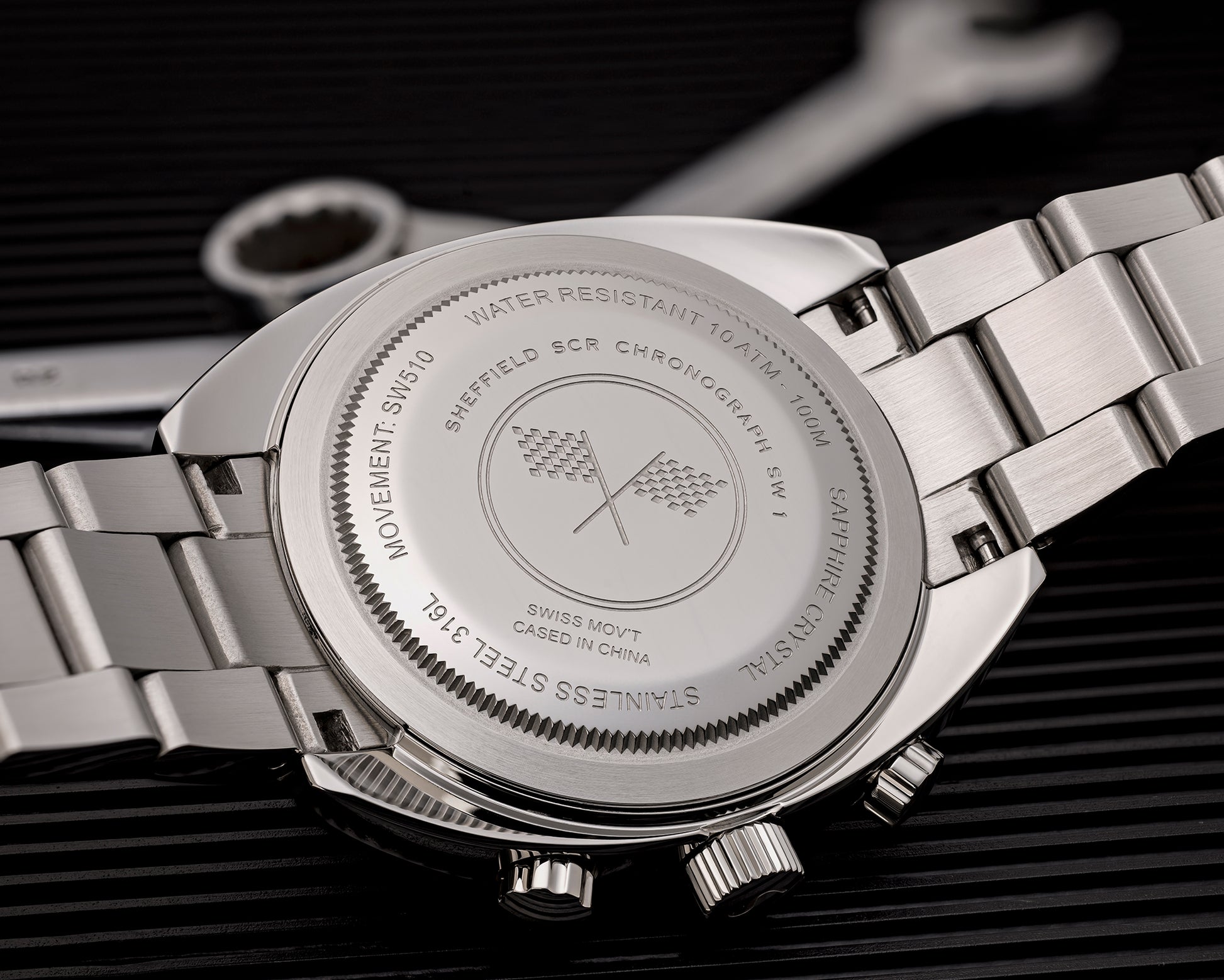 The SCR CHRONO SW is a VERY Limited Edition. Spike Feresten's vision and reference to '60s and '70s classic chronograph design introduced in the SCR Chrono VK is further enhanced with the power of the Swiss Sellita SW 510 W BH a. This renowned automatic chronograph movement has been a mainstay in numerous premier timepieces: 23 jewels, 63-hour power reserve beating at 28,800 vibrations per hour (4Hz). As in the VK, nothing was spared in terms of build and material, and it shows. You can feel the quality and heft of the 42mm 316L case and steel bracelet as well as see the fine detail and finish of the white linen dial and blue markers through its anti-glare coated sapphire crystal. Both a steel bracelet and leather strap are included. Everything about this watch is unique and special. That's why there are only a handful available. Sheffield is proud to offer this unique timepiece.